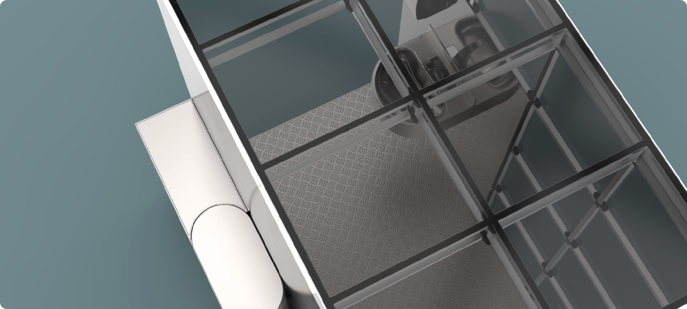 Interconnecting framework elements were developed to allow the booths to be easily assembled, transported, and installed while maintaining structural stability.